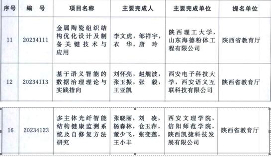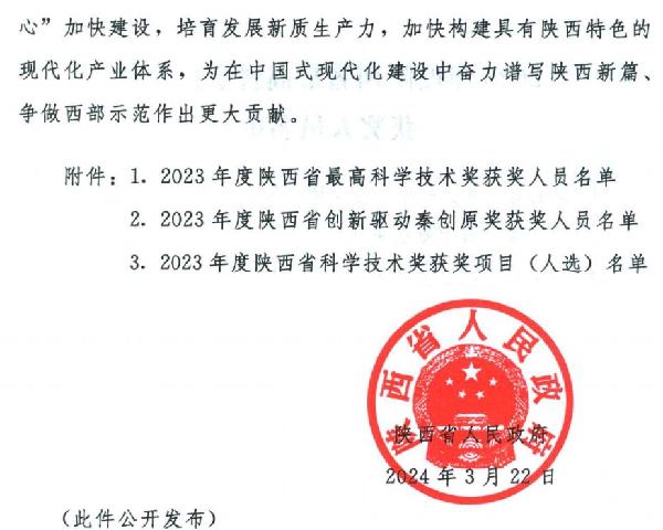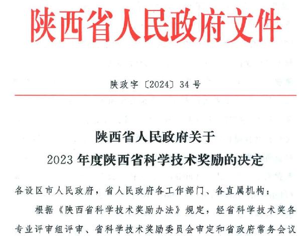 2024年3月22日,陕西省科学技术厅发布了《陕西省人民政府关于2023年度陕西省科学技术奖励的决定》(陕政字[2024]34号),公司机材公司张晓丽、刘凌、杨森林等组成的科研团队申报的《多主体光纤智能结构健康监测系统及自修复方法研究》荣获了陕西省科技进步三等奖。