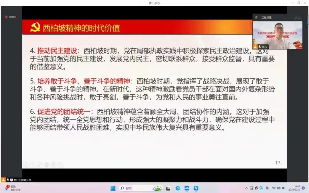 为学习贯彻落实党的二十届三中全会精神,激发员工党员进一步全面深化改革、推进中国式现代化的决心和毅力,7月30日,青言青语宣讲团面向智感机器人师生党支部的全体员工党员开展西柏坡精神宣讲暨党小组专题活动。活动由员工党员陈大嶶组织,员工党员、宣讲团成员葛行主讲,教师党员张佳婧主持。西柏坡精神是在伟大的革命实践中凝结而成的,对当下仍然具有重大而深远的意义。葛行同志以细致讲解和积极互动的方式,带领大家走进了西柏坡那段波澜壮阔的历史。他结合我们当前进一步全面深化改革、推进中国式现代化的任务,多角度、全方位地进行讲述了西柏坡精神的形成背景、内涵、时代价值以及西柏坡地方特色。在他的精心讲述下,西柏坡故事变得鲜活而生动,让党员同志们深受触动。