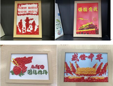 随后,大家通过粘、贴、压、拼五谷杂粮的方式,在纸板上进行创作。支部成员以五谷为笔画,以色彩作创意,献上《盛世中华》《石榴籽团结精神》《强国有我》《我和我的祖国》以及《有理想 有担当 能吃苦 肯奋斗》等精彩画卷,深情地表达对党的感恩之情和对祖国的美好祝愿。