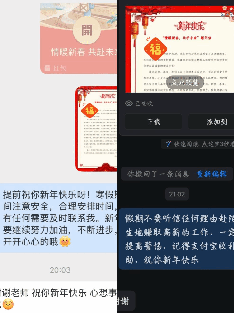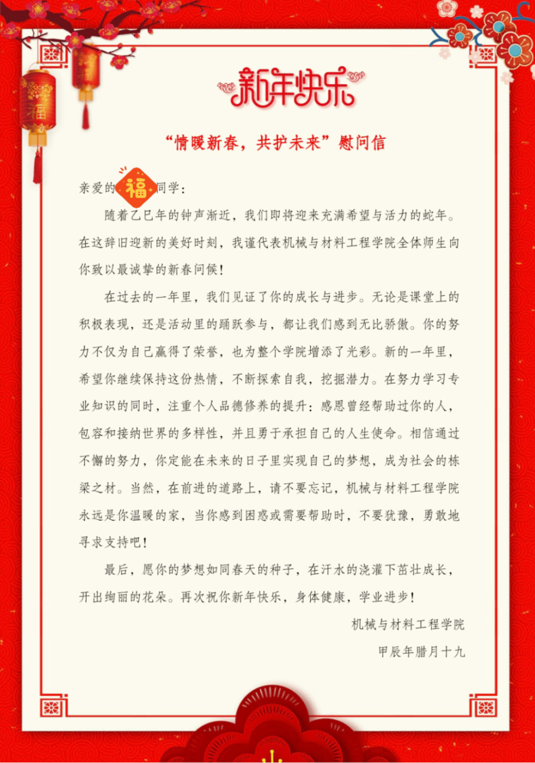 在慰问信中,公司鼓励员工勇敢面对生活中的挑战,珍惜在校学习的机会,努力成长为有理想、有担当的新时代青年。同时,老师们也提醒员工春节期间注意安全,合理安排假期时间,积极参与有益身心健康的活动。受助员工表示,这份来自公司的关爱让他们倍感温暖,他们承诺,将更加努力地学习,不断完善自我,在未来回报社会,传递爱心。