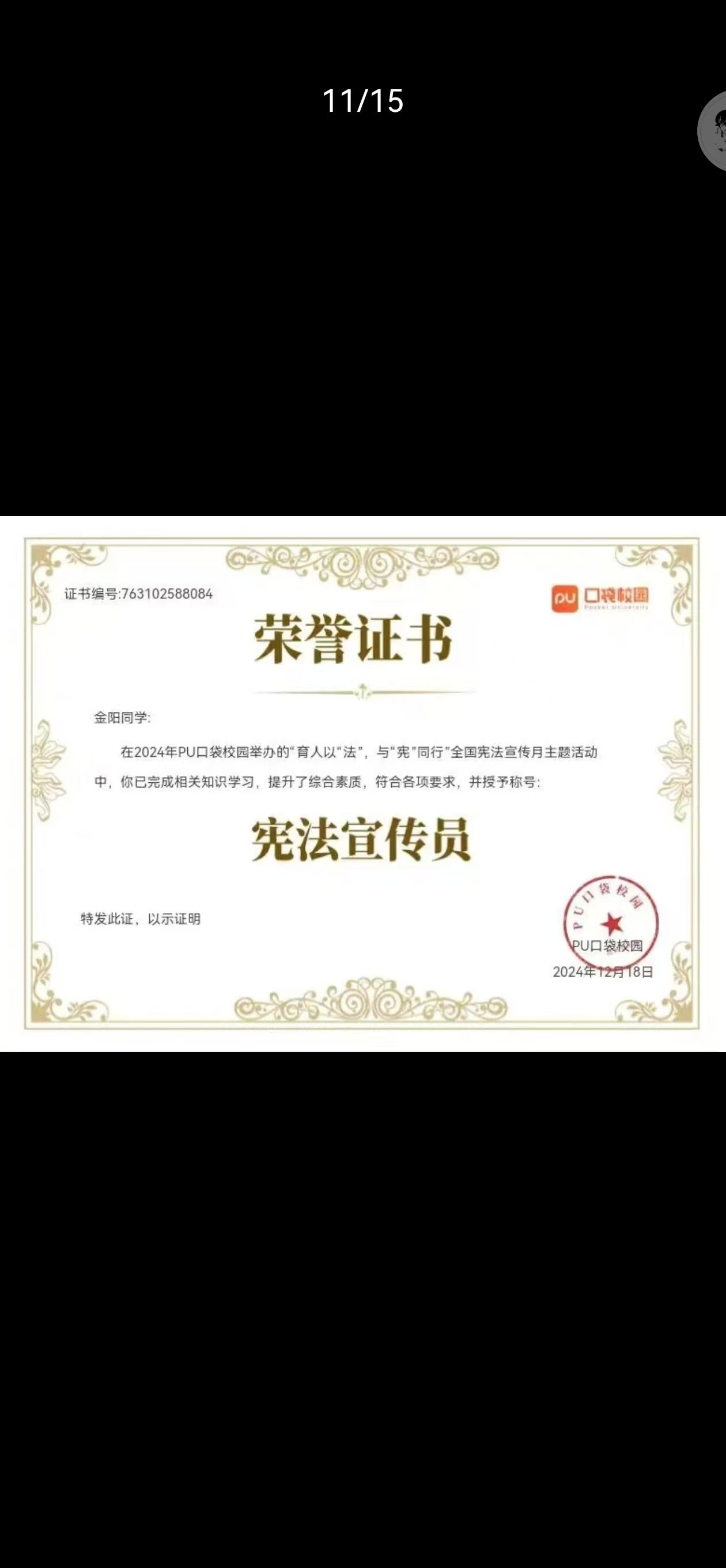 2024年12月4日是我国第十一个“国家宪法日”。宪法是国家的根本大法,具有最高的法律效力。在全面依法治国的进程中,加强宪法教育对于增强老员工的法治观念、维护宪法权威至关重要。本次学习活动是以线上直播课形式开展,主讲人为中央社会主义公司教授马聪,课程内容为《宪法的渊源、效力及其意义》。同学们通过集体学习和个人学习完成后,即可获得PU口袋校园第二课堂3个学时和由PU口袋校园颁发的“宪法宣传员”荣誉证书。