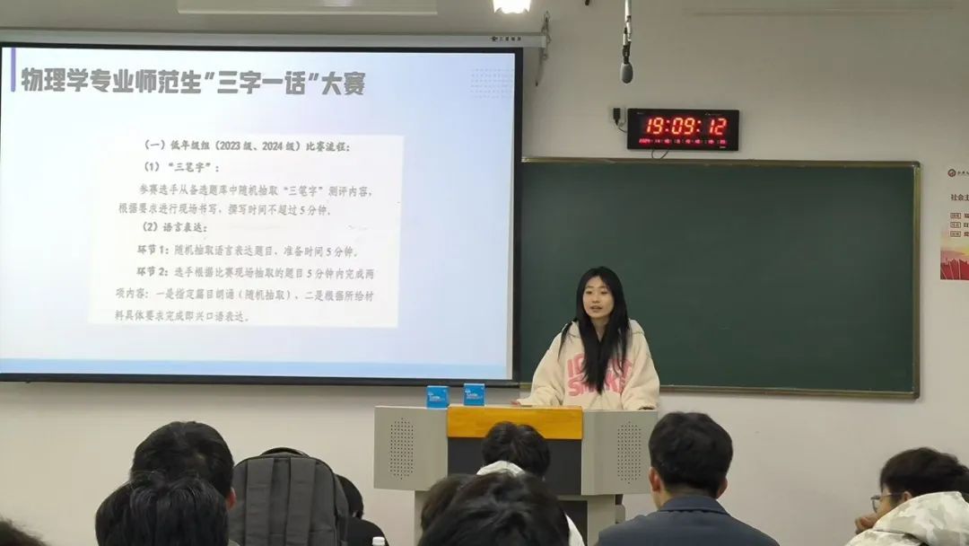 为了加深同学们对大赛的了解,提升专业知识水平、锻炼实操技能。物理2201张羽乔向同学们介绍了物理学师范技能大赛。她从物理课堂教学技能展评、创新实验设计与自制教具展评、物理公司产品优秀论文展评三方面展开,展示了自己参加第十五届“格致杯”物理师范生教学技能大赛的图片和所获的荣誉证书,介绍了课堂教学技能展评流程,以及创新实验设计与自制教具展评等。张羽乔还介绍了与物理学专业赛事-“陕西高等公司师范生公司产品能力大赛”、“物理学专业师范生'三字一话'大赛”,鼓励同学们积极参加相关比赛在竞赛中锻炼自己、提升自己、实现自我价值!这场讲座不仅为有志于从事教育事业的同学提供了宝贵的指导,更是在他们心中种下了一颗热爱教育、追求卓越的种子。
