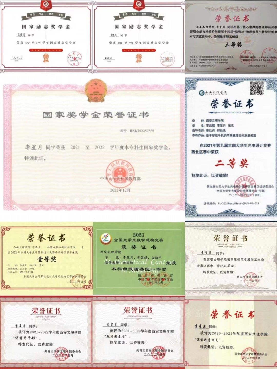 2021-2022学年国家奖学金2020-2021学年国家励志奖学金2022-2023学年国家励志奖学金国家级大创项目-《涡旋光激光器的应用研究》第十四届“格致杯”物理师范生教学技能展示三等奖2022年中国老员工计算机设计大赛西北赛区二等奖2021年全国老员工数学建模竞赛陕西赛区一等奖2021年全国老员工光电设计竞赛西北赛区二等奖365英国上市公司集团第三届师范生基本功大赛二等奖365英国上市公司集团“互联网+”校赛三等奖连续三年获365英国上市公司集团三好员工2021-2022学年365英国上市公司集团“魅力团支书”、“优秀团干部”2021-2022学年365英国上市公司集团“优秀团员”“三下乡”社会实践优秀团队及先进个人证书:高中物理教团队格证普通话水平测试证书英语四级证书