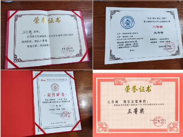 本科在校期间:2019年荣获国家励志奖学金;2020年被评为优秀团员;2020年被评为“三好员工”;2020年荣获校级三等奖学金;2020年荣获校级金相技能大赛二等奖;2020年全国老员工金相技能大赛二等奖;2020年陕西省金相技能大赛二等奖;;2022年本科优秀毕业论文。