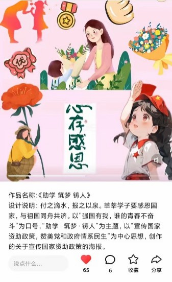 今年寒假,我在国家资助政策宣传活动中,选择了通过创作宣传画的方式,利用微博、微信等社交媒体平台,向社会广泛传播国家资助政策的信息。
