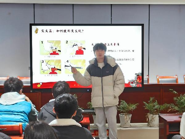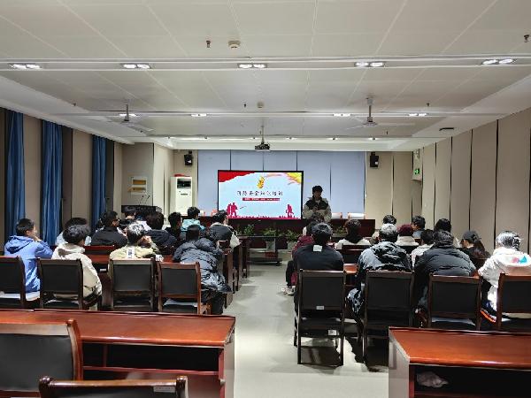 王杨世豪介绍了本次培训的目的。他强调,消防安全培训有助于增强同学们的消防安全意识,提高应急避险能力。倡议现场所有同学承担起安全宣传员的责任,树立“预防为主,防消结合”的观念,践行“四知一诺”,共同筑牢校园消防安全“防火墙”。