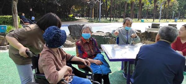 活动伊始,枫叶整合照护养老中心负责人对同学们表示了热烈的欢迎,并开展了详尽的培训。同学们在了解了与长者的交流技巧、熟悉了轮椅的使用方法之后,跟随养老中心负责人一同陪伴老人前往新纪元公园。