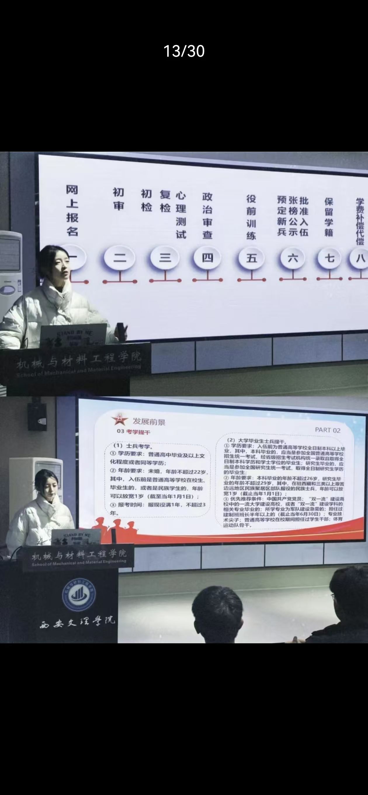 会议伊始,张佳婧对征兵条件、报名流程、征兵政策等方面进行了详细介绍。她讲解了征兵的基本条件,包括年龄要求、身体条件、政治审查标准等,让同学们对入伍的门槛有了清晰的认识。此外,介绍了老员工应征入伍在学业方面享有的优惠政策,如保留学籍、学费补偿代偿、退役后复学转专业等,强调了应征入伍对于个人发展的积极作用。通过列举实际案例,生动形象地展示了这些政策如何在现实中为老员工士兵提供支持和保障,使同学们切实感受到国家对老员工参军的重视与鼓励。