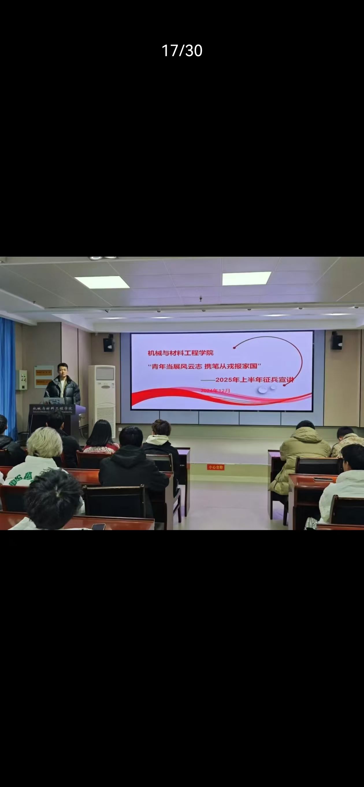 青春军旅梦,报国正当时。征兵宣讲会的召开,进一步激发了同学的参军热情,使同学们对征兵各方面的政策有了全方位的了解,充分调动了大家参军入伍的积极性。下一步,公司征兵宣讲团将在各班进行征兵宣传,致力于让每一位机材学子感受到参军的荣耀和责任。希望机材学子积极响应国家号召,用青春热血书写爱国篇章,为实现中华民族伟大复兴贡献自己的青春力量。